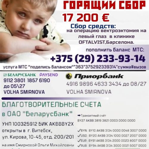 Фадей Смирнов, мальчик из Витебска, 2016 года рождения, снова нуждается в поддержке. У него диагностирована гипотония левого глаза, и чтобы сохранить зрение, необходима сложная операция — вектроэктомия. Провести её готовы специалисты клиники OFTALVIST в Барселоне.