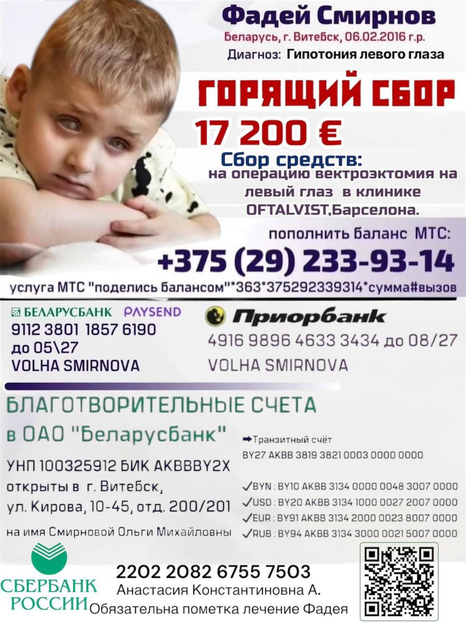 Фадей Смирнов, мальчик из Витебска, 2016 года рождения, снова нуждается в поддержке. У него диагностирована гипотония левого глаза, и чтобы сохранить зрение, необходима сложная операция — вектроэктомия. Провести её готовы специалисты клиники OFTALVIST в Барселоне.